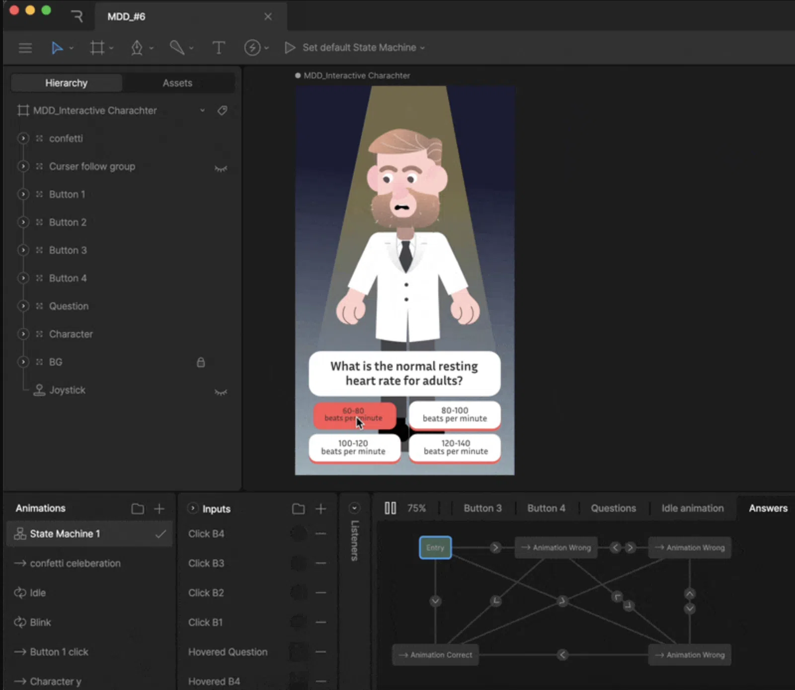 - Animate the character’s celebration for correct answers.